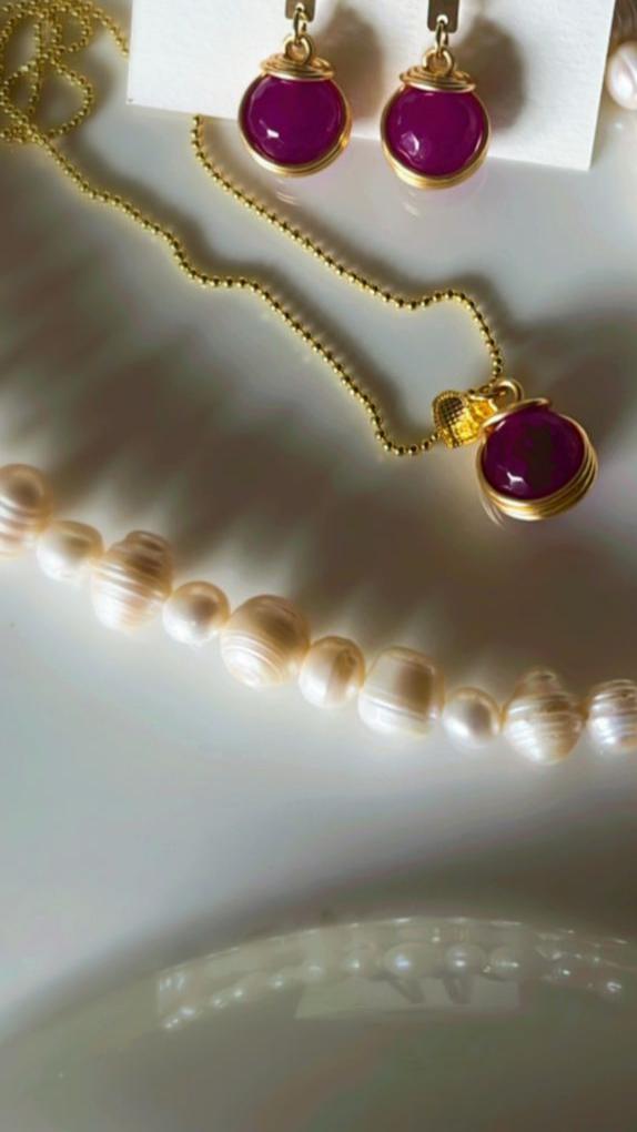 Elevate your style with this stunning handmade jewelry set, crafted with care in Chile. The set features a delicate 14K gold-plated chain, measuring 46 cm in length, paired with beautiful earrings adorned with round bases also plated in 14K gold. The earrings showcase elegant mauve agate stones, adding a touch of sophistication and color to your look.