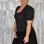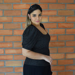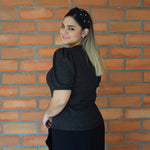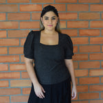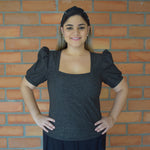 Square neck shirt elaborated in lurex. The style of the sleeves is perfect to feel comfortable and fresh. Use it with your favorite Jeans or Skirt. Model is wearing Size Large. I love the knitted style of this shirt, which is also cool and comfortable. The puff sleeves gives it a delicate and sophisticated style. Also, it has sparkles of glitter which makes it perfect for a night out or to wear it in a relaxed way with jeans during the day. Experience luxury with Lustrous Allure: Square Neck Lurex Shirt. It's a perfect combination of comfort and glamour, with a knitted design and delicate puff sleeves that give off sophisticated vibes. The subtle hint of glitter adds a touch of elegance, perfect for a night out or a casual day look with your favorite jeans.