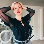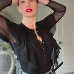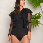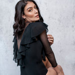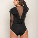Waterfall Ruffle Bodysuit with Transparent Mesh Sleeves
