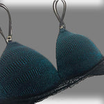 Experience ultimate comfort with our Pre-shaped, Wire-free Bra. Made of black mesh with turquoise lurex threads, this soft cup bra is accented with engraved black lace. The 4 hook x 2-row back fastening ensures a secure fit, while adjustable straps with small metallic circular accessory in the upper front complete the look. Enjoy the perfect combination of comfort and style with our Wire-free Bra.