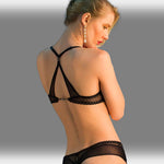Exquisitely crafted from luxurious Tulle and detailed with intricate Tulle embroidery and decorative elastic, this soft cup underwire bra features an eye-catching criss-cross back adorned with elegant lace and dazzling rhinestones. The secure closure is located at the front and adjustable straps complete the look.