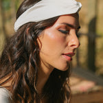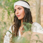 A satin headband with silver-sequined tulle. Wear as a turban or classic band. Adds sparkle and style to your bridal look.