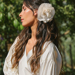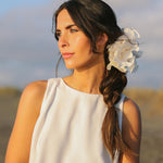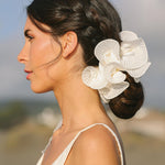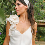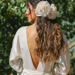 A handmade flower hairpiece with silk and angel skin fabric. Features a loop system for easy styling. Unique and original for your big day.