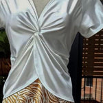 Discover unparalleled elegance and comfort with our exclusive designed shirt. Crafted from a luxurious blend of polyester, lycra, and nylon, this garment ensures unmatched softness, durability, and a subtle shimmering fabric with a front knot detail that adds a touch of sophistication.