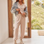 Paired with the blouse, our jogger pants feature a trendy and relaxed design that effortlessly balances fashion and ease. The jogger-style silhouette offers a modern and versatile look that can be dressed up or down to suit any occasion.