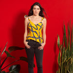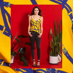 Introducing our versatile pajama or loungewear set featuring a top with ruffled straps and sleeves, printed with eye-catching blue or orange chains on a vibrant yellow or blue background. Made with a soft and breathable cotton and viscose finish, this set includes matching long pants for the perfect combination of comfort and style. Mix and match the top with jeans for a cute day or night look. The set fits any body type, and you can choose your usual size. Don't miss out on the chance to elevate your loungewear game with this must-have set.