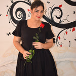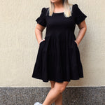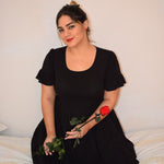 This striking black dress is crafted from a luxurious blend of rayon cotton and lycra, featuring side pockets for a touch of convenience. With its loose, relaxed fit and breathable fabric, it is a perfect companion for both day and evening wear. The model in the image is wearing a size large. Indulge in ultimate comfort and effortless style with our oversized and loose-fitting dress. Crafted from a sumptuous blend of rayon cotton and lycra, this stunning dress boasts a relaxed fit and breathable fabric for all-day wear. Featuring convenient side pockets, it's the perfect choice for any occasion, day or night. Just like our model, you'll exude luxury and ease in this luxurious dress.