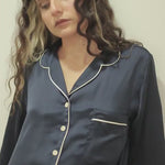 Introducing our elegant and versatile pajama set - the perfect addition to your loungewear collection. This set includes a classic buttoned shirt with a t-shirt neckline and long sleeves, paired with comfortable and chic high-waisted pants that have a satin touch. The oversized fit adds to the relaxed and comfortable feel of this set, while still looking stylish and sophisticated.