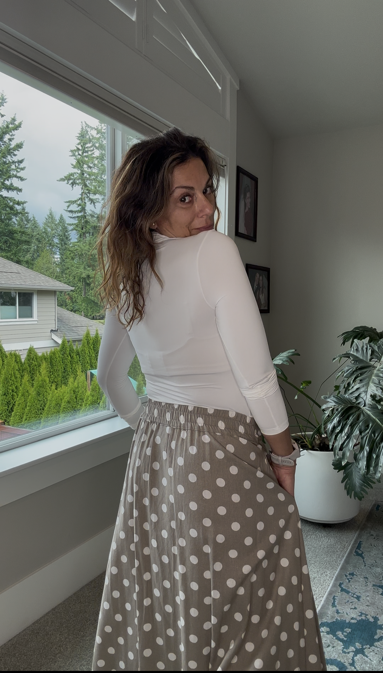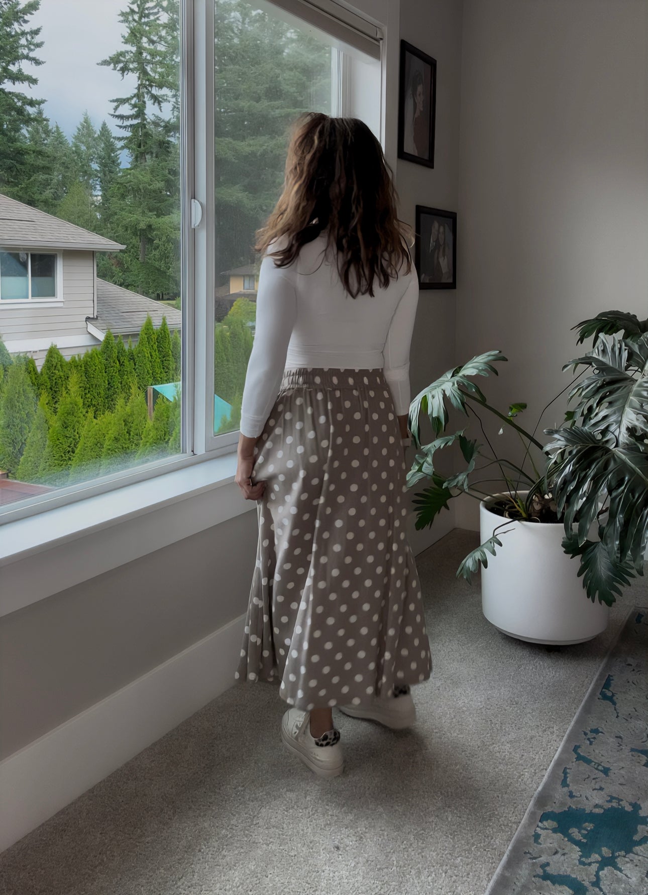 This beige midi skirt with white polka dots is that effortlessly pretty piece your closet has been waiting for. Crafted from breathable linen, it features a flattering midi length, a soft elastic waistband in the back, and a clean front with decorative buttons for a polished finish.