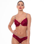 A luxurious thong crafted with intricate wine lace and embellished with sparkling rhinestones of the highest quality. Delicate cotton lines the intimate area. Sophisticated sophistication for the modern woman. Enjoy effortless elegance and comfort in this timeless piece of lingerie.