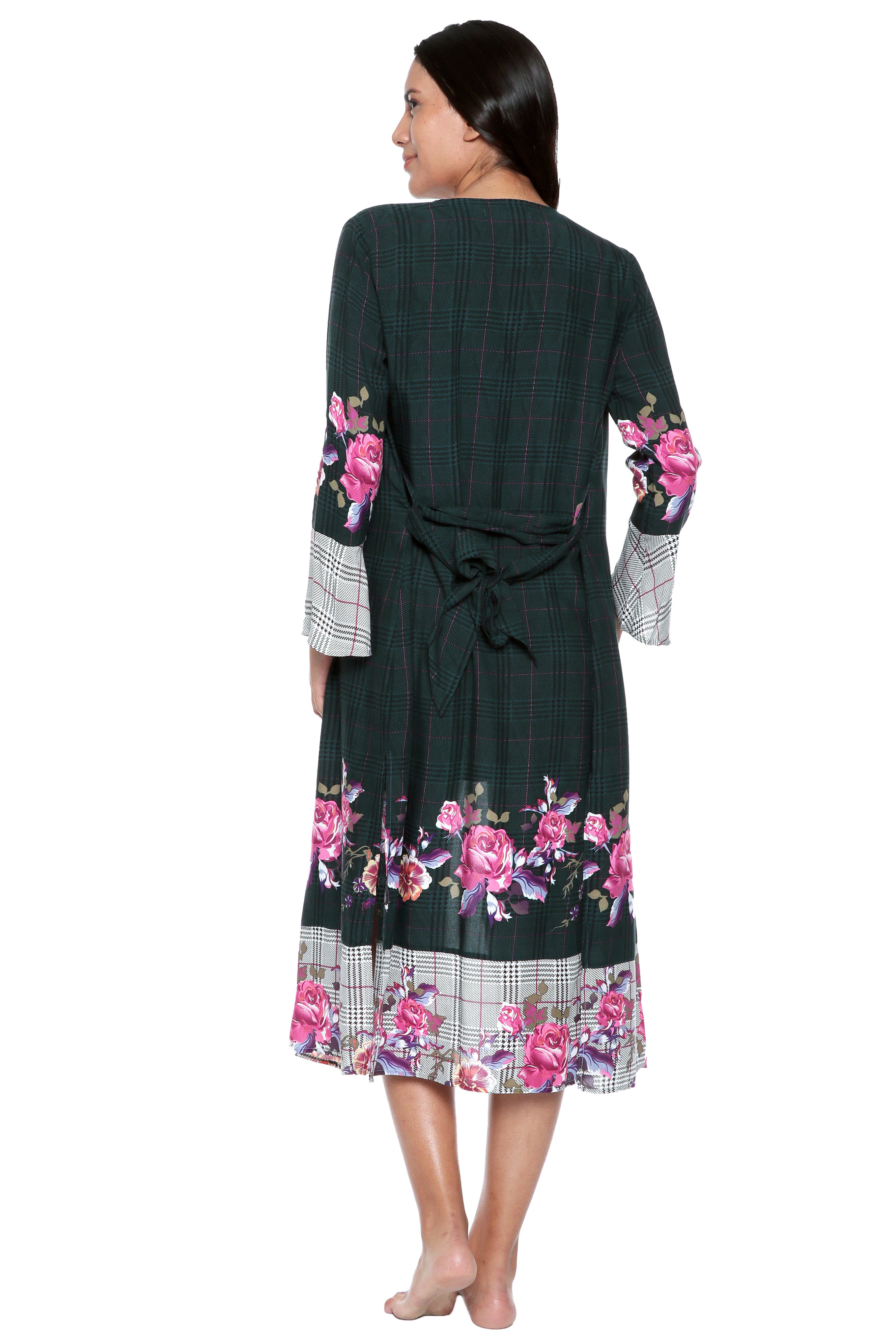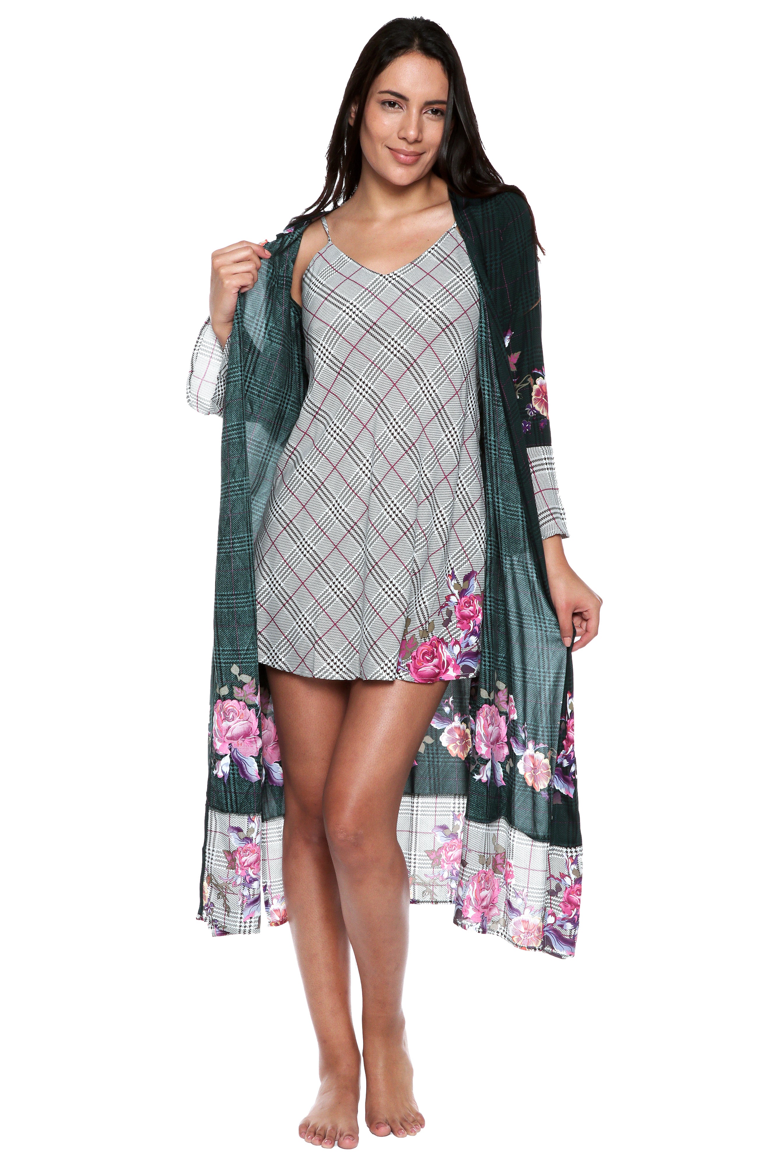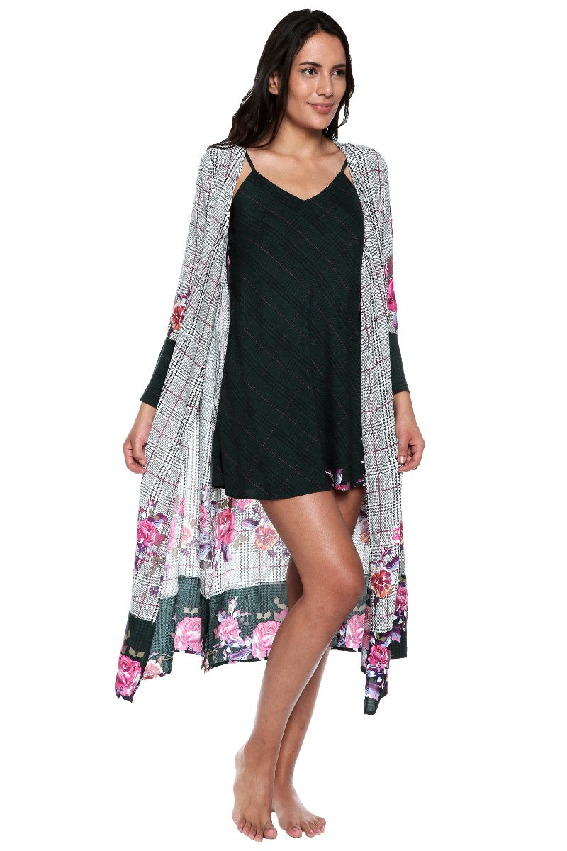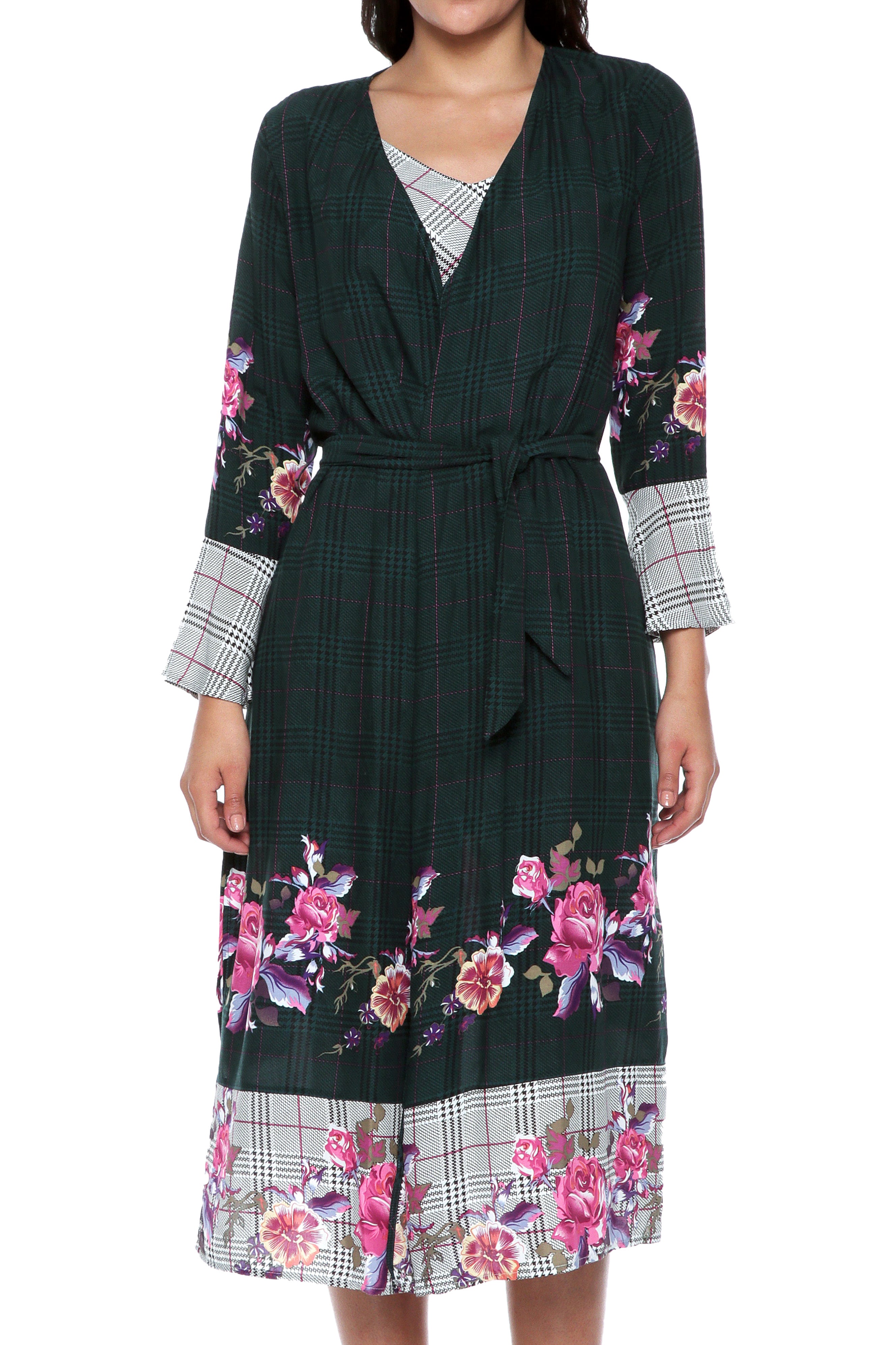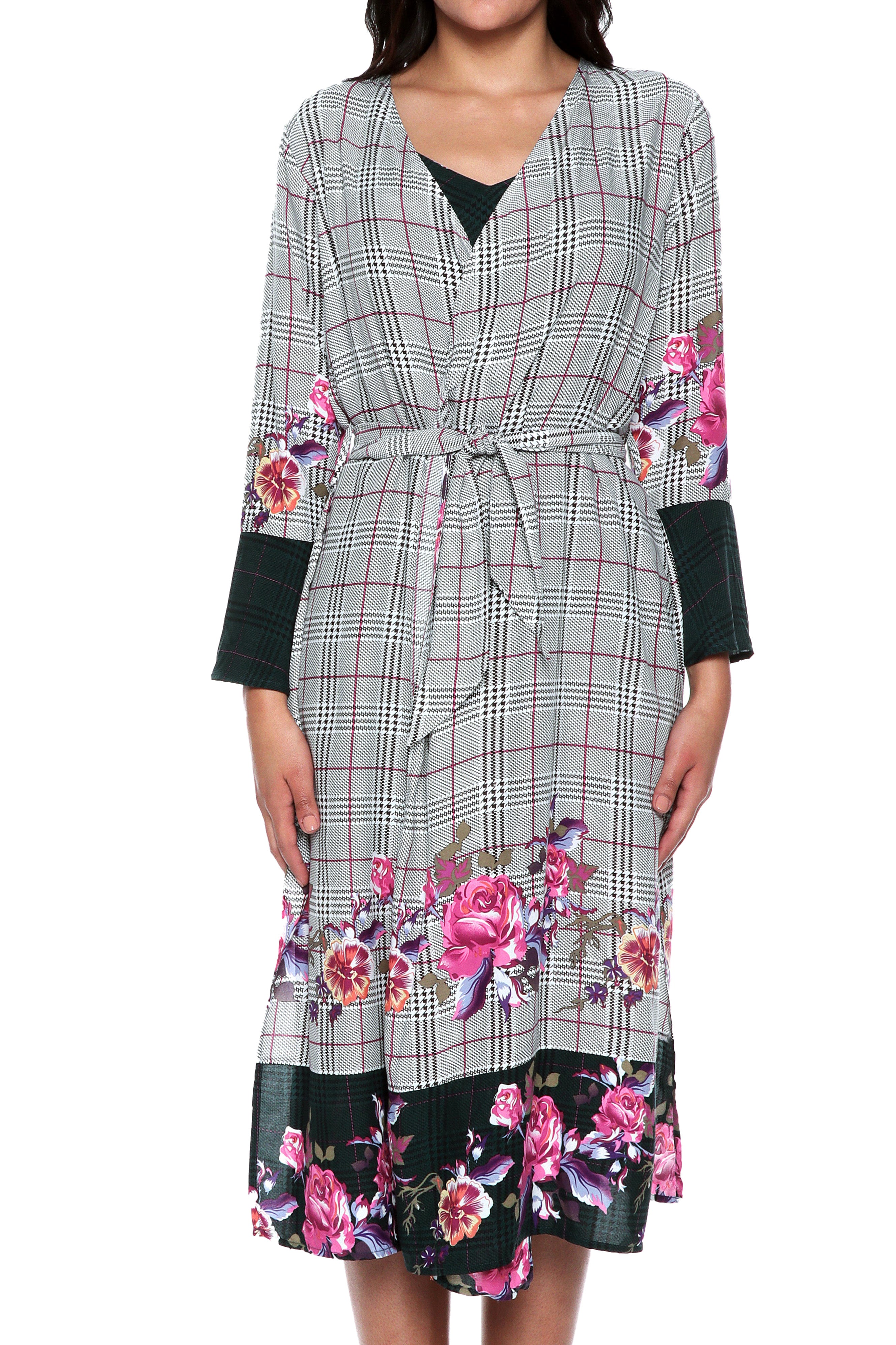 Introducing our latest addition, a stunning kimono with a unique design that will turn heads. The plaid background in either gray or green combined with the delicate pink floral print creates a harmonious contrast that is both eye-catching and elegant.