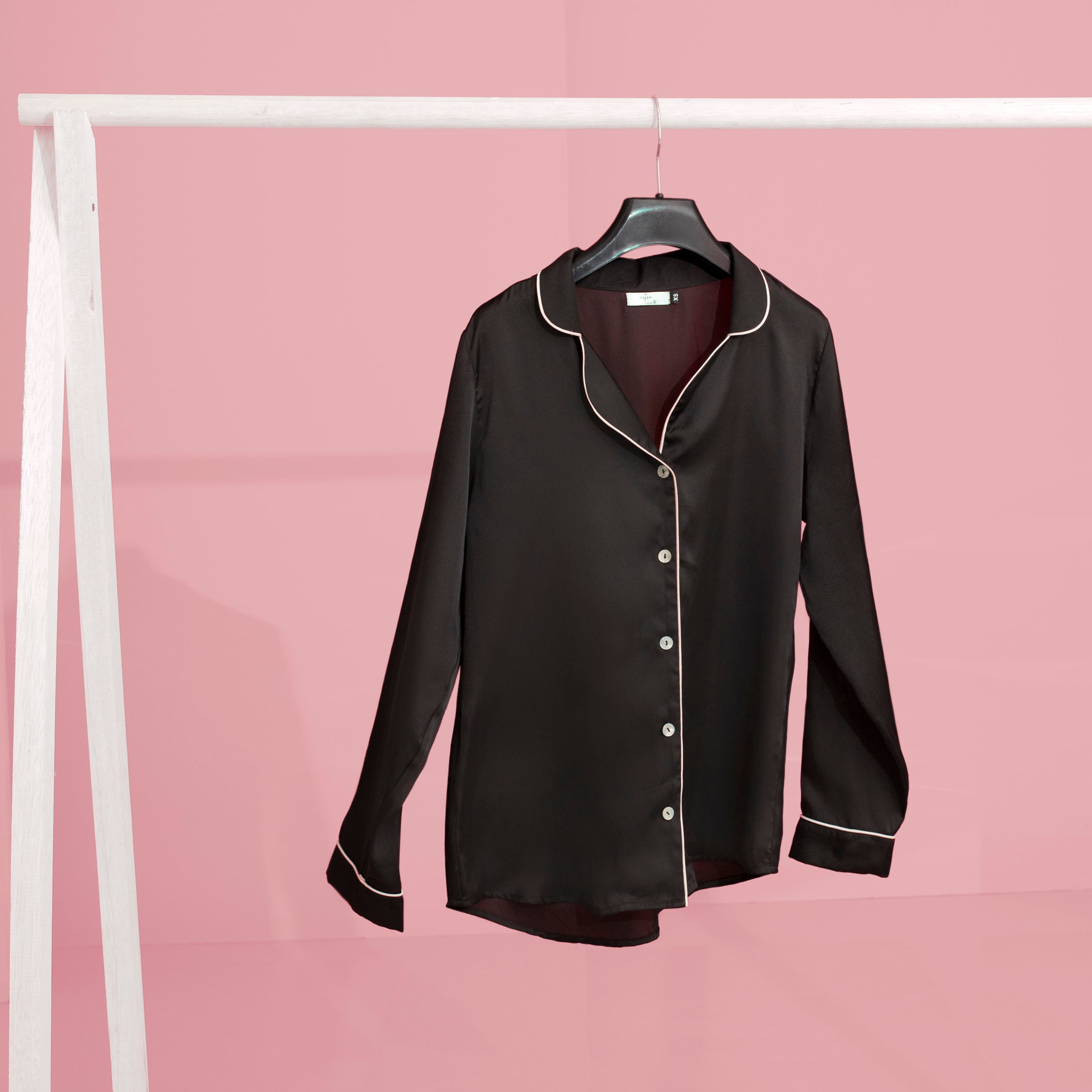 Introducing our elegant and versatile pajama set - the perfect addition to your loungewear collection. This set includes a classic buttoned shirt with a t-shirt neckline and long sleeves, paired with comfortable and chic high-waisted pants that have a satin touch. The oversized fit adds to the relaxed and comfortable feel of this set, while still looking stylish and sophisticated.