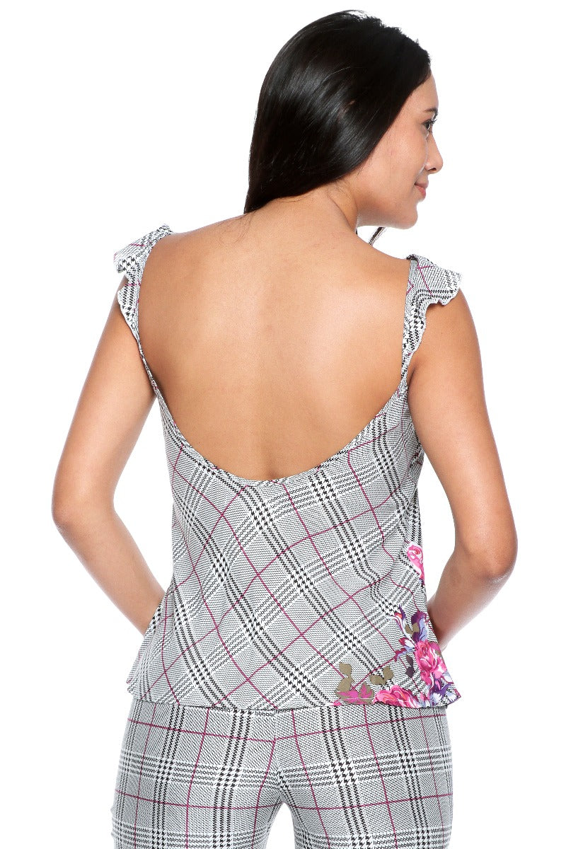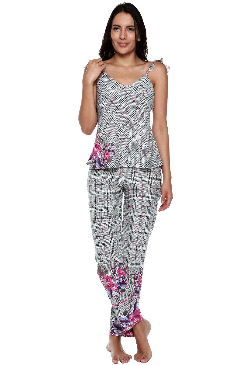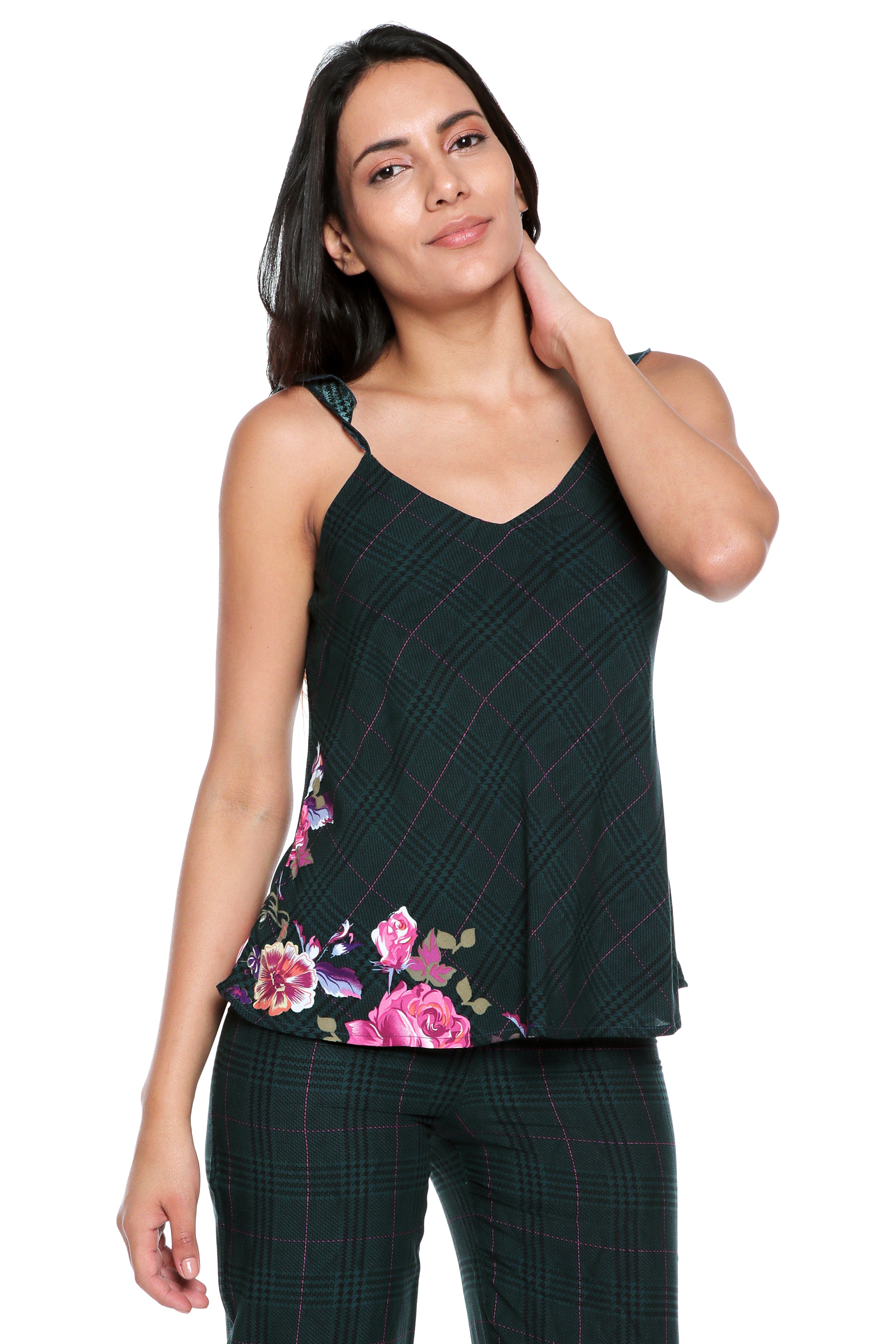 Introducing our Spring Collection top, featuring ruffle straps and a beautiful floral print in pink hues on a green or gray background. Made from a soft cotton with a luxurious viscose finish, this top is perfect for loungewear or to wear out and about paired with shorts or pants. The versatile design allows for mix-and-match options, making it a great addition to your wardrobe. Order now and experience the comfort and style of our Spring Collection.