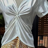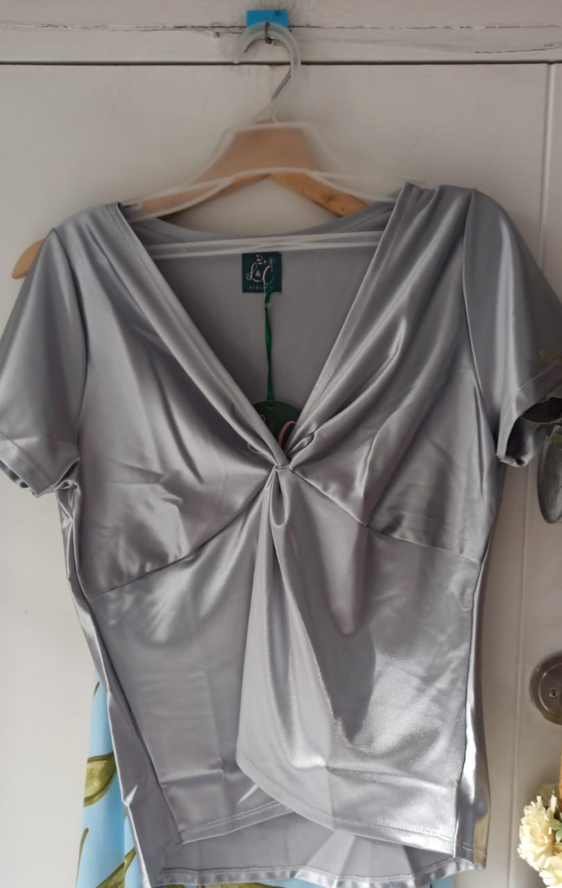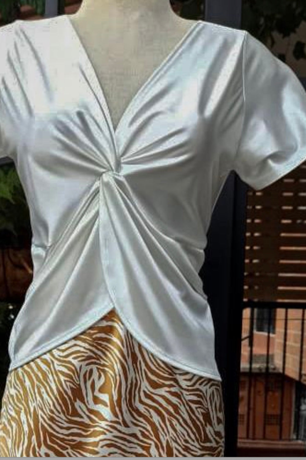 Discover unparalleled elegance and comfort with our exclusive designed shirt. Crafted from a luxurious blend of polyester, lycra, and nylon, this garment ensures unmatched softness, durability, and a subtle shimmering fabric with a front knot detail that adds a touch of sophistication.