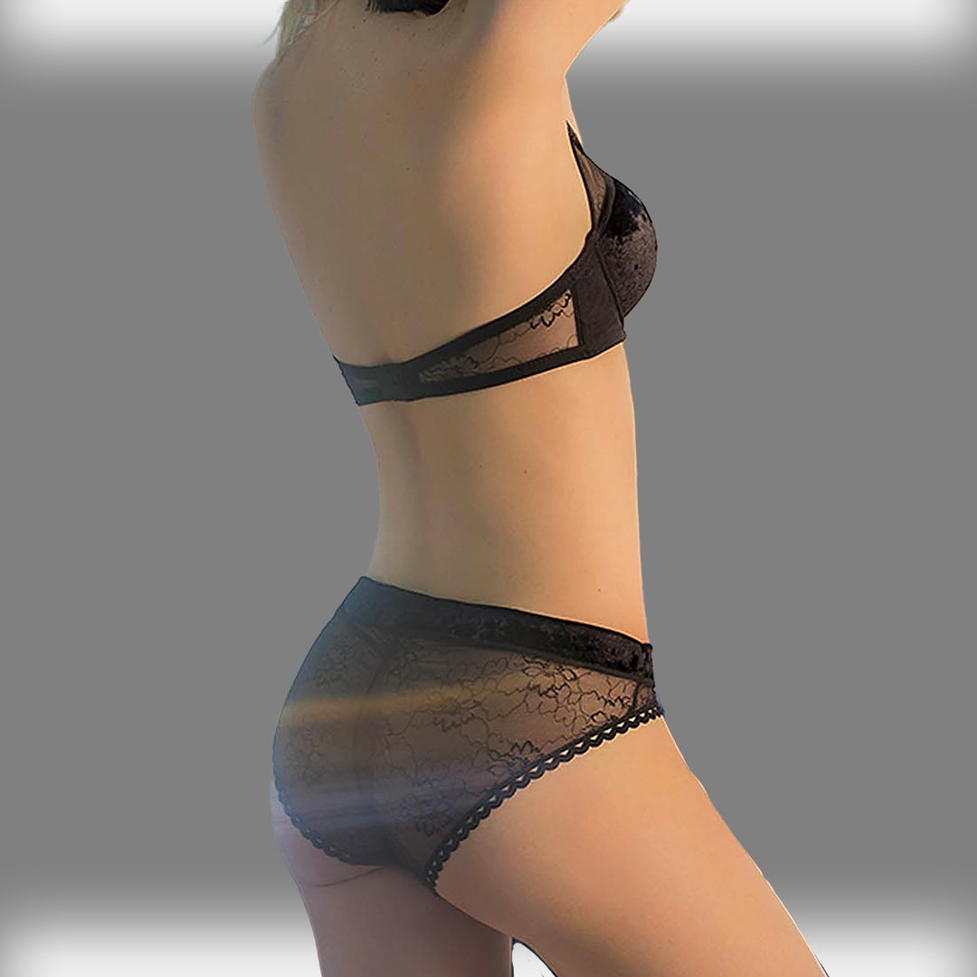 The combination of mesh and velvet fabric creates a captivating contrast that enhances its seductive appeal. The cups feature a luxurious shiny velvet fabric adorned with intricate black engraved lace on the top, adding a touch of sophistication to the design.