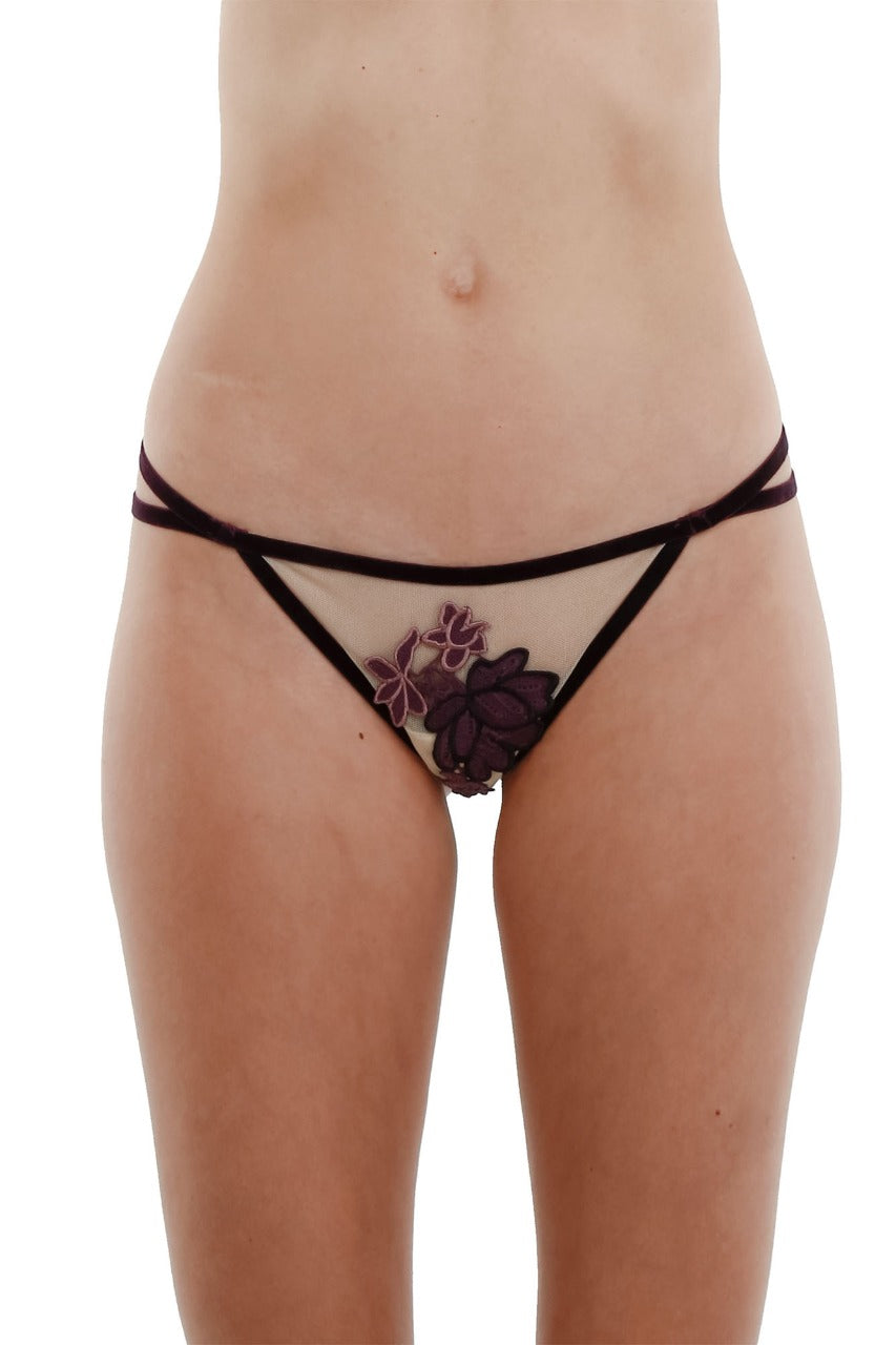 Adorned with Brazilian stretch tulle, plush velvet elastic waistband, and intricately-embroidered front flower detail, our exquisite garment is sturdily reinforced with 100% cotton.