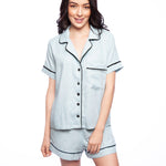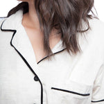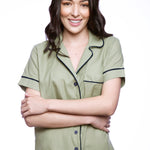 Introducing our Velvet Detail Pajama Set - the ultimate combination of style, comfort and breathability. Made with a blend of cotton (45%), viscose (38%) and linen (16%), these pajamas are designed with velvet details on the sleeves, neckline, and shorts. The shirt features a button-up design and pockets for added convenience. The shorts are loose and breathable, making them perfect for sleeping in. Available in a variety of colors, these pajamas are perfect for any occasion, whether it be lounging at home or as a gift for a loved one. Made with high-quality materials, this pajama set is built to last and provide ultimate comfort.