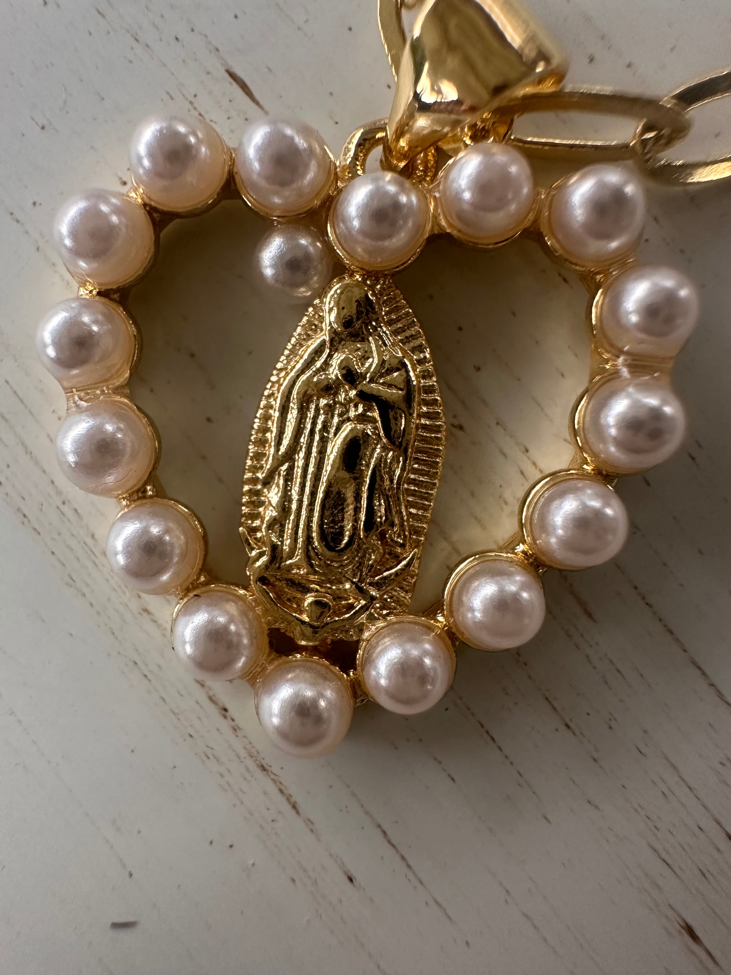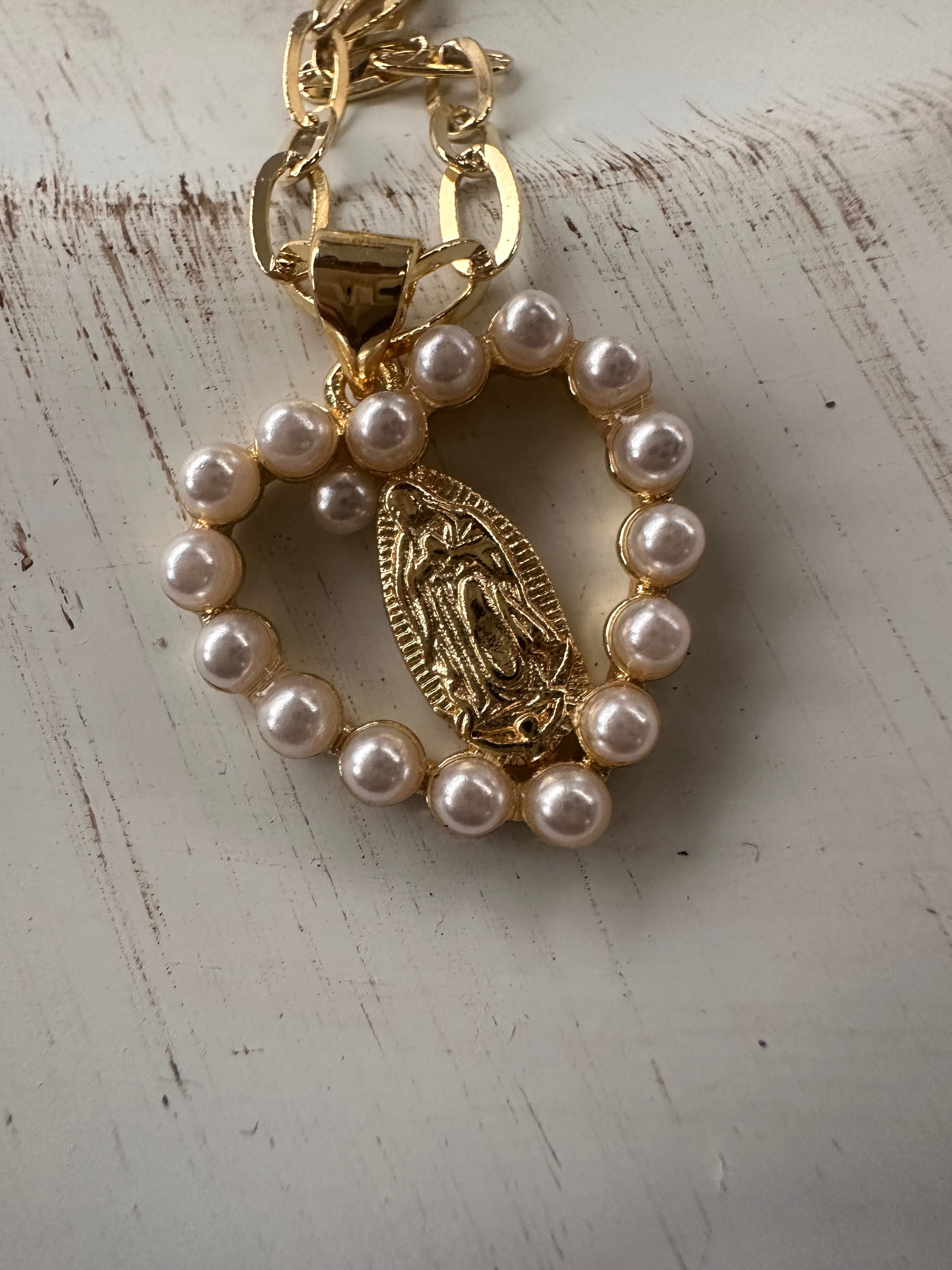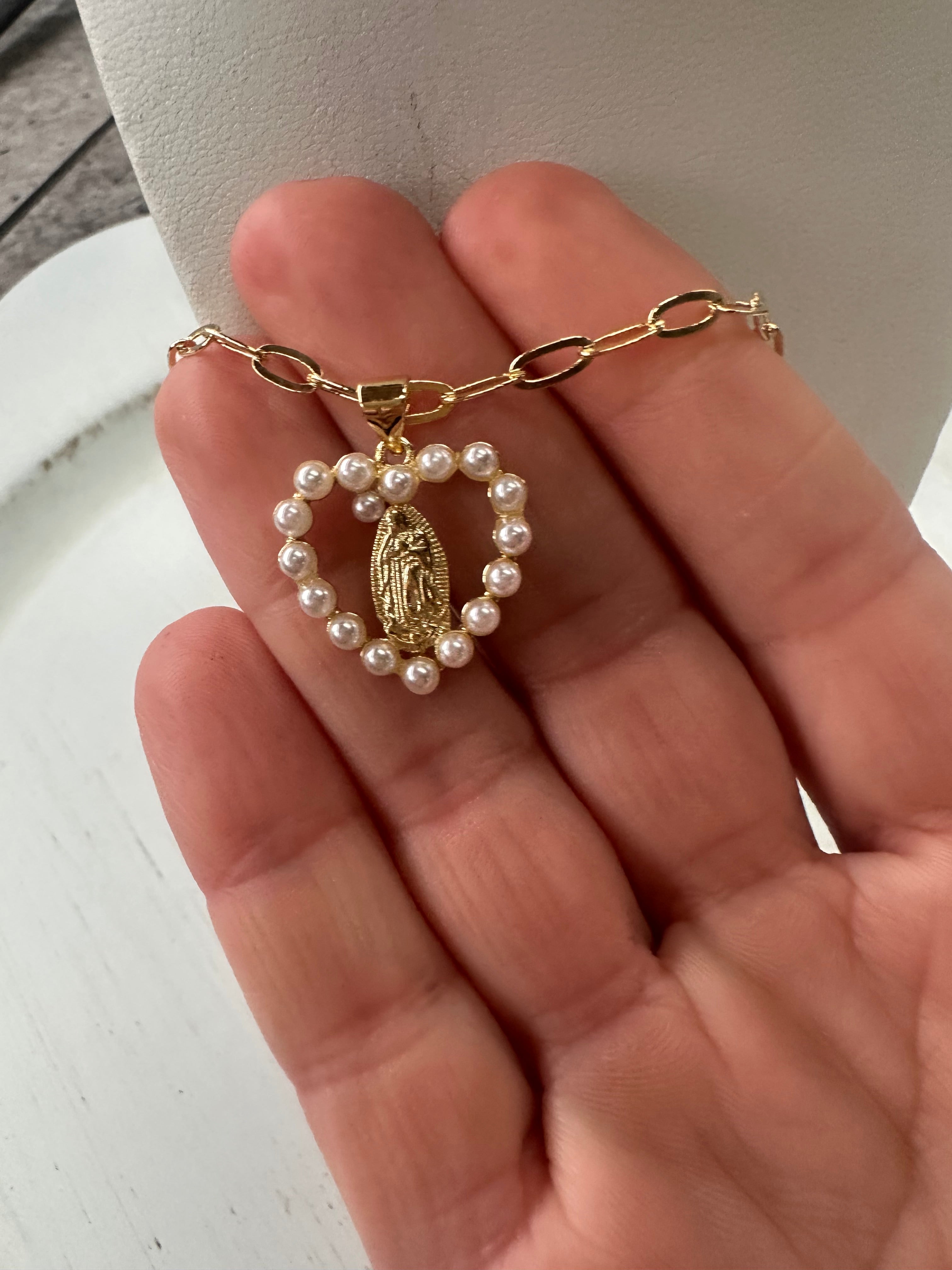 Elevate your style with this exquisite Virgin of Guadalupe Pendant, beautifully adorned with luminous pearls and sparkling zircon stones. Expertly crafted with 18K gold plating, it radiates a brilliance that captures both faith and sophistication.