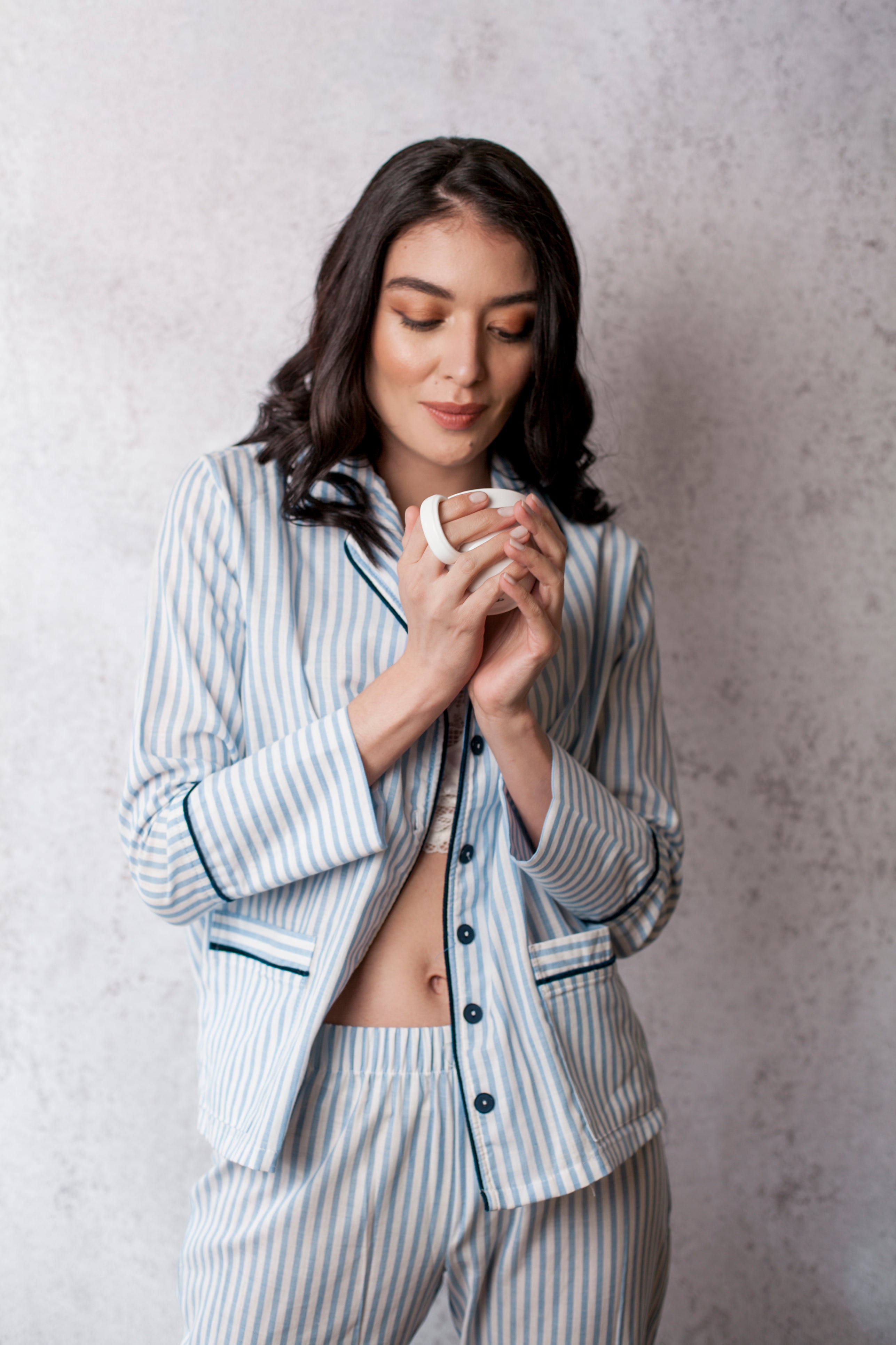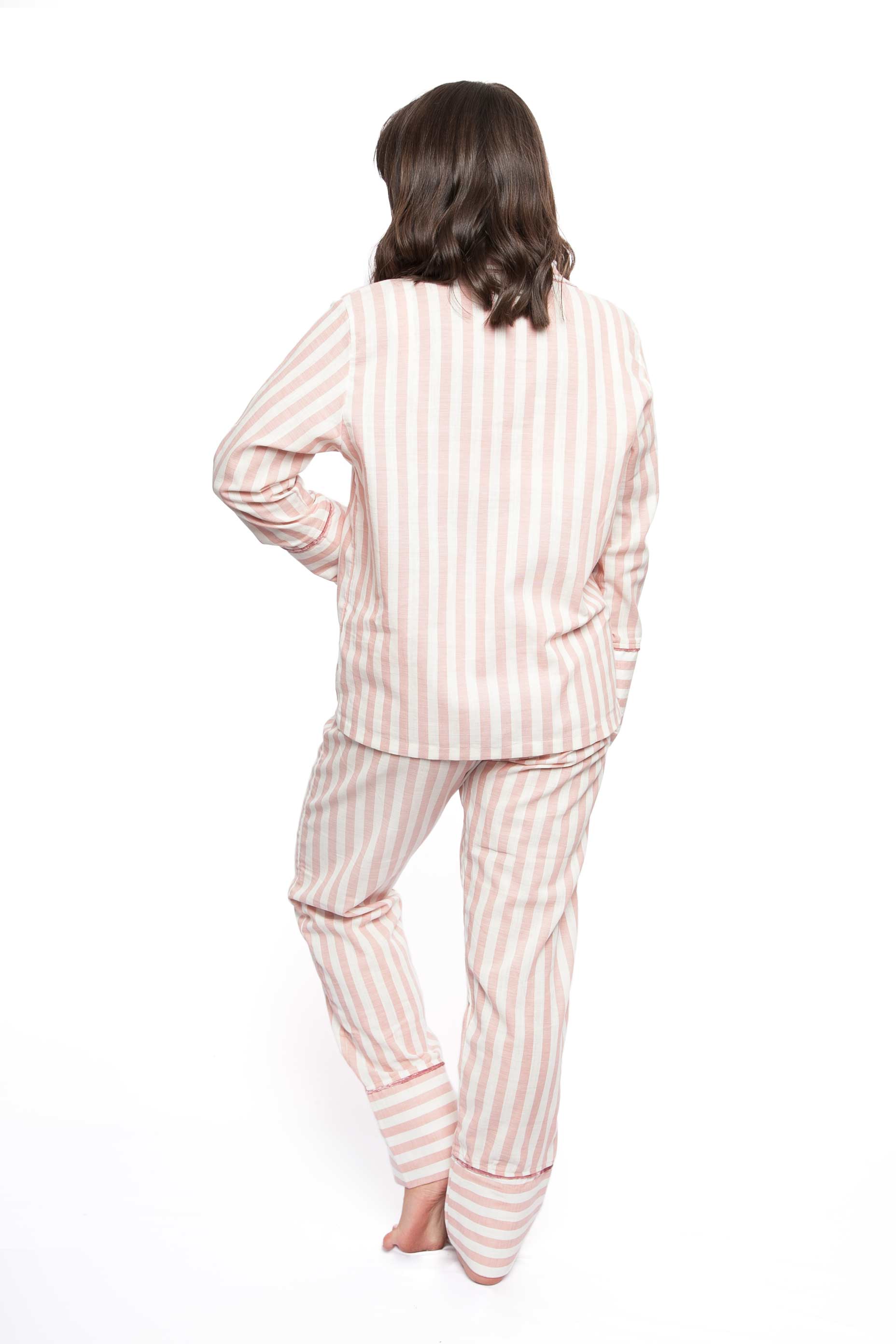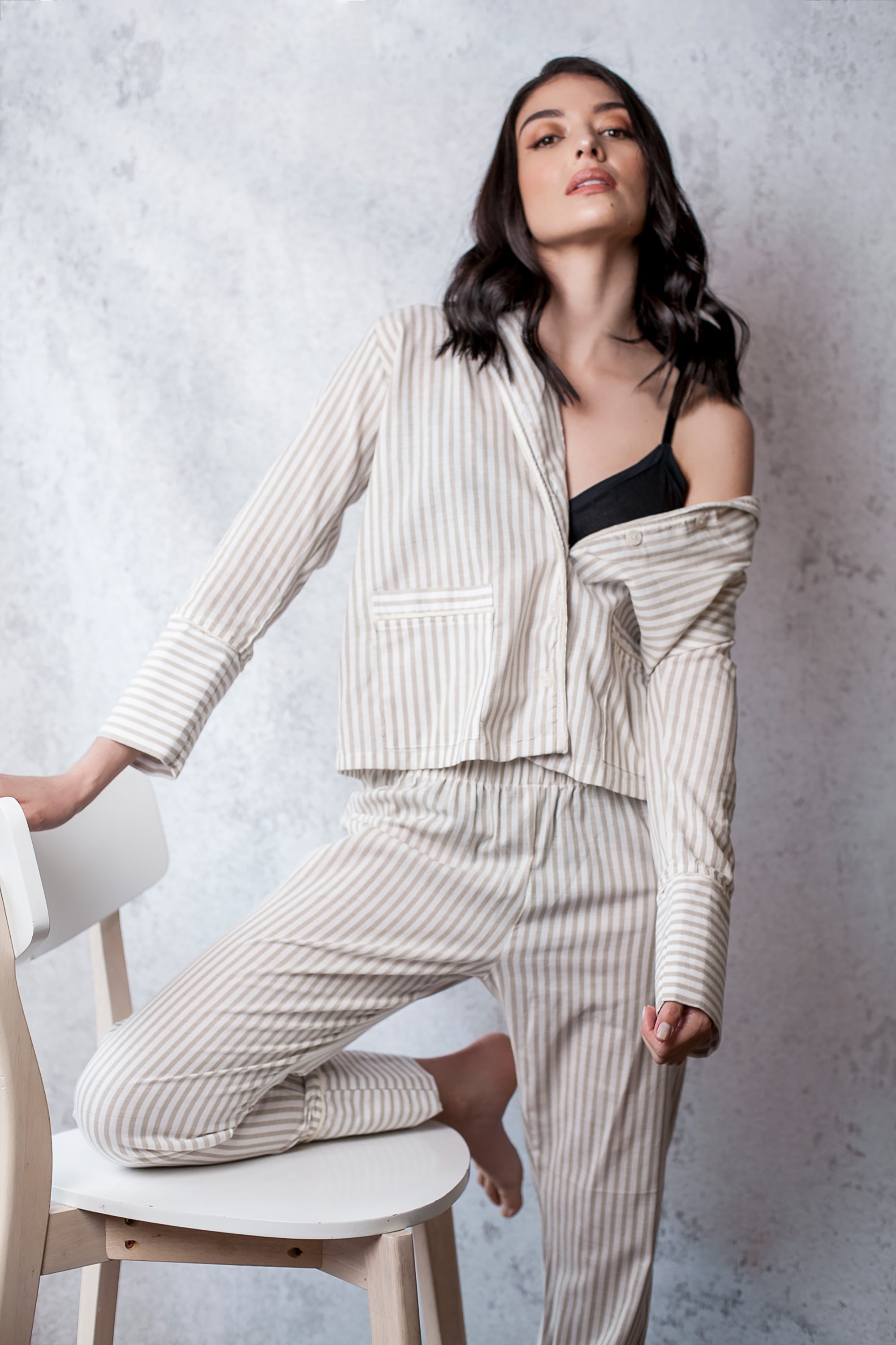 This comfortable and stylish pajama set is perfect for anyone who values both comfort and style. Made from 100% soft, breathable cotton, this set is perfect for any season. The set features velvet details on the sleeves, pockets, neck, and pants ends for a luxurious touch. The shirt has pockets and buttons, and the pants are long and wide for maximum comfort while sleeping. The pants also have a high and loose waist for added comfort. The fabric is striped in different colors, making it perfect for any season and adding a touch of elegance to your sleepwear. Available exclusively on our Shopify store, this pajama set is perfect for anyone looking for a high-quality, comfortable sleepwear option.