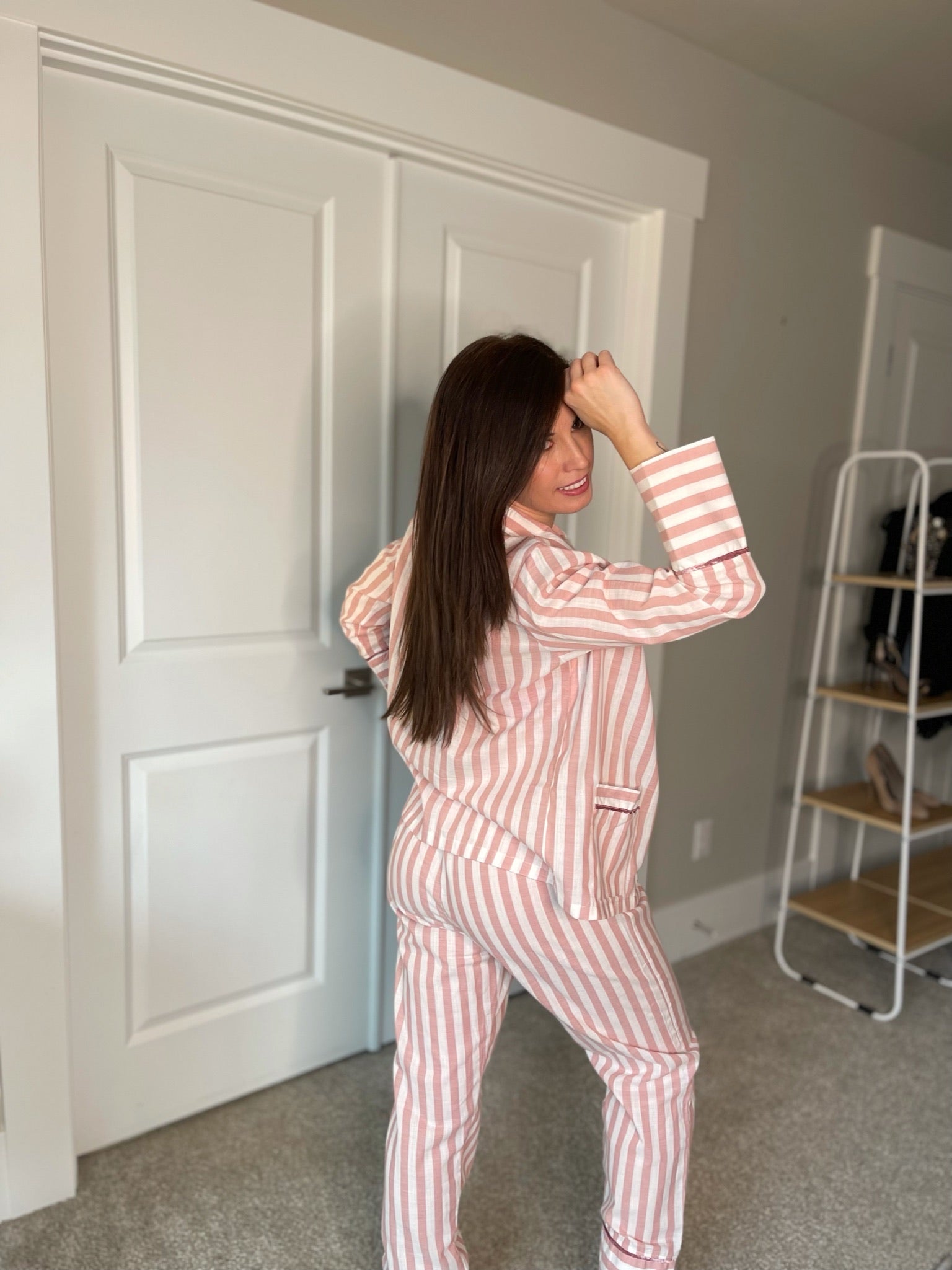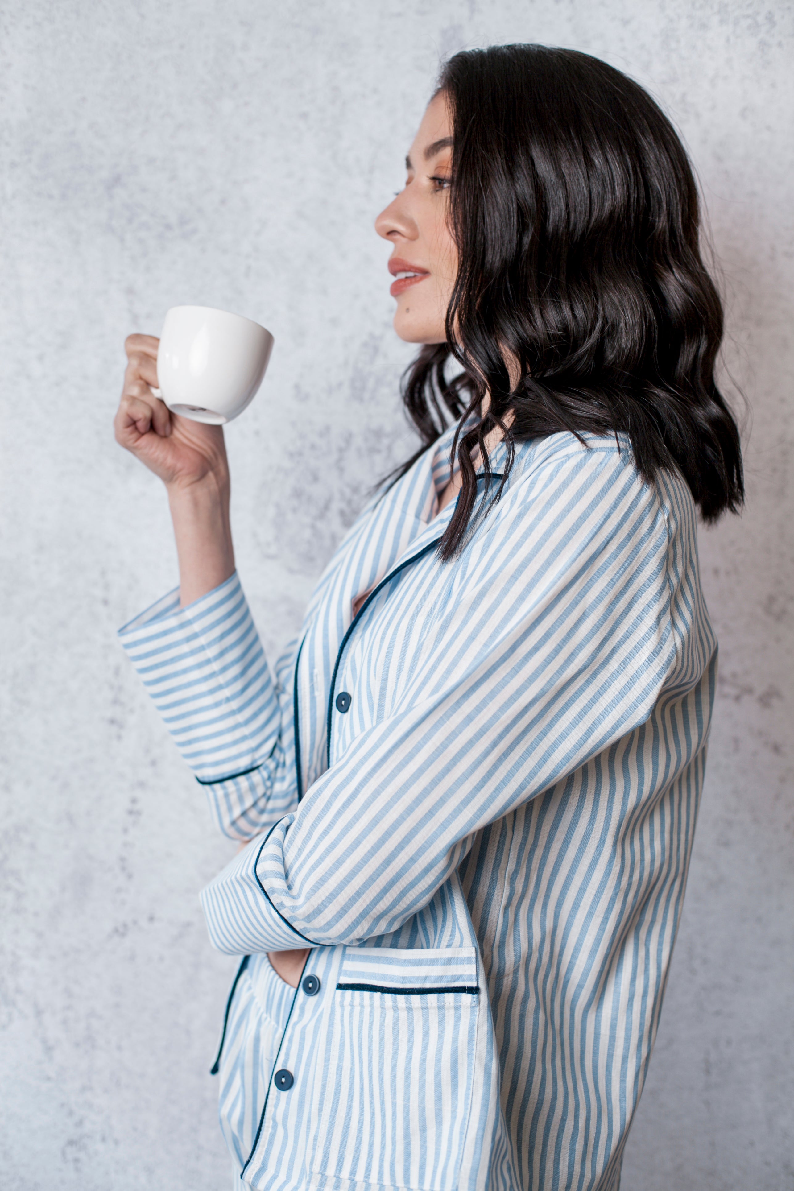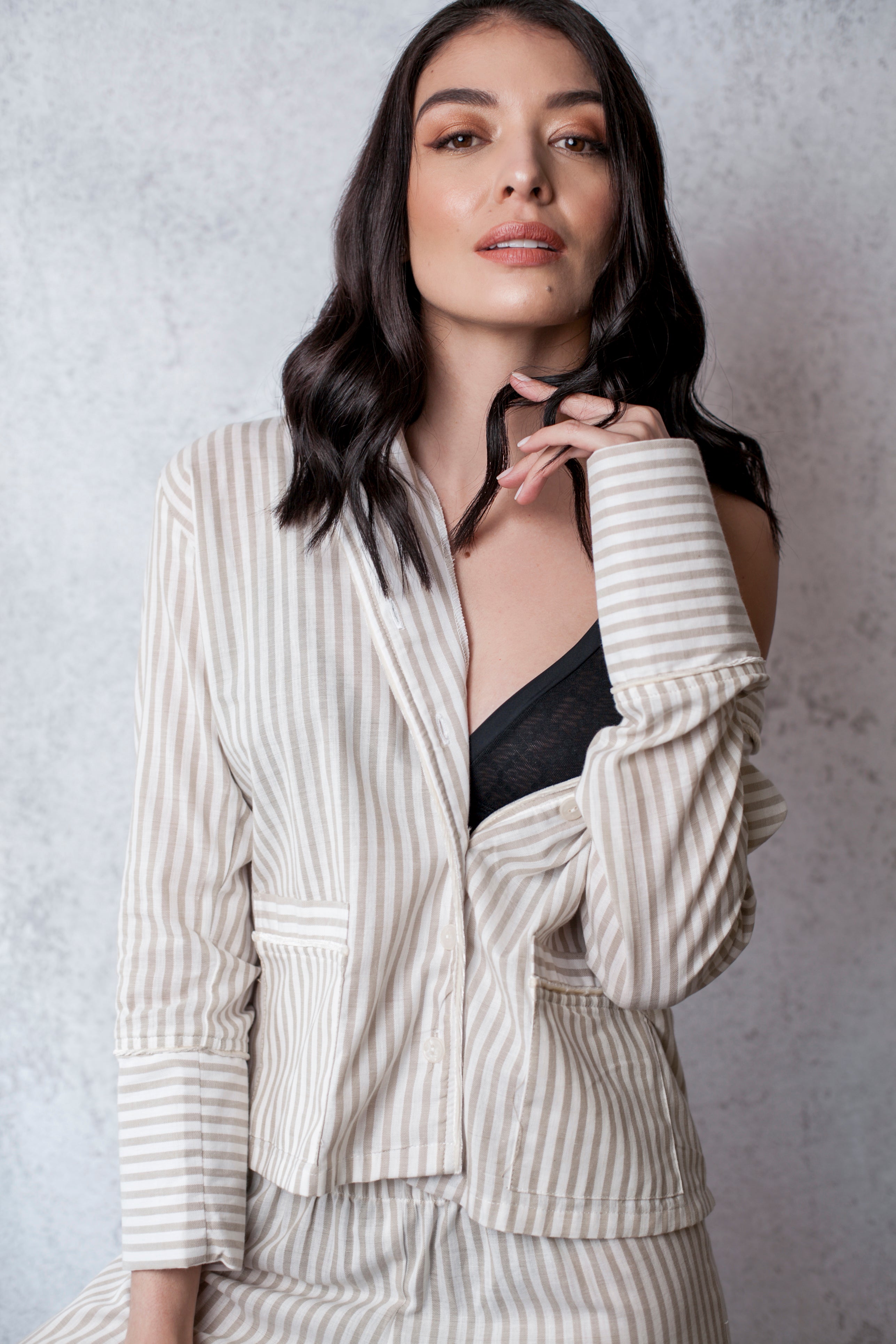 This comfortable and stylish pajama set is perfect for anyone who values both comfort and style. Made from 100% soft, breathable cotton, this set is perfect for any season. The set features velvet details on the sleeves, pockets, neck, and pants ends for a luxurious touch. The shirt has pockets and buttons, and the pants are long and wide for maximum comfort while sleeping. The pants also have a high and loose waist for added comfort. The fabric is striped in different colors, making it perfect for any season and adding a touch of elegance to your sleepwear. Available exclusively on our Shopify store, this pajama set is perfect for anyone looking for a high-quality, comfortable sleepwear option.