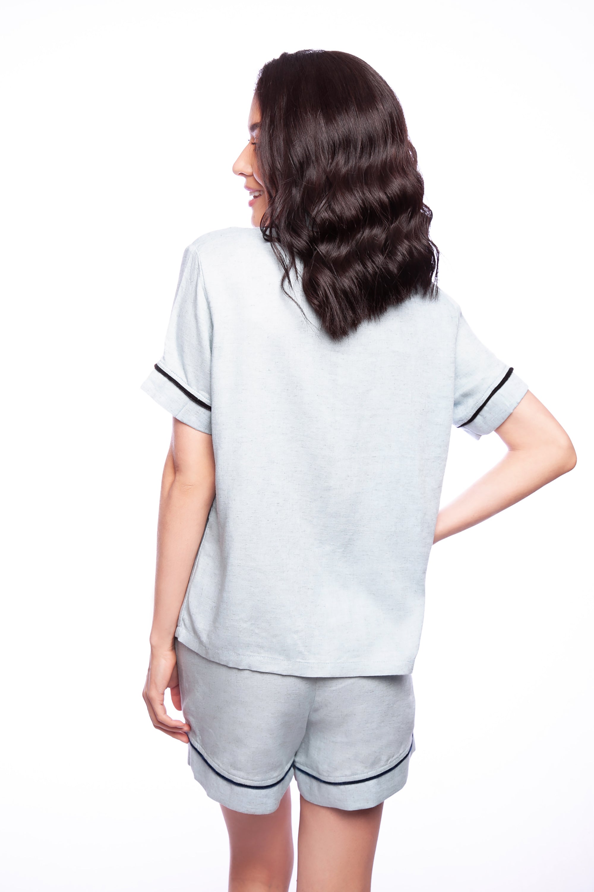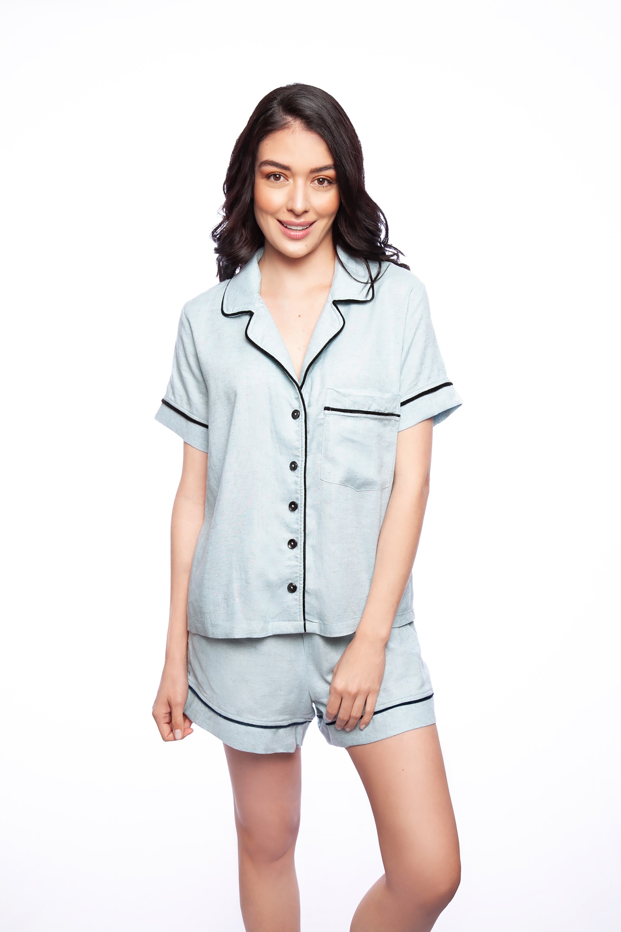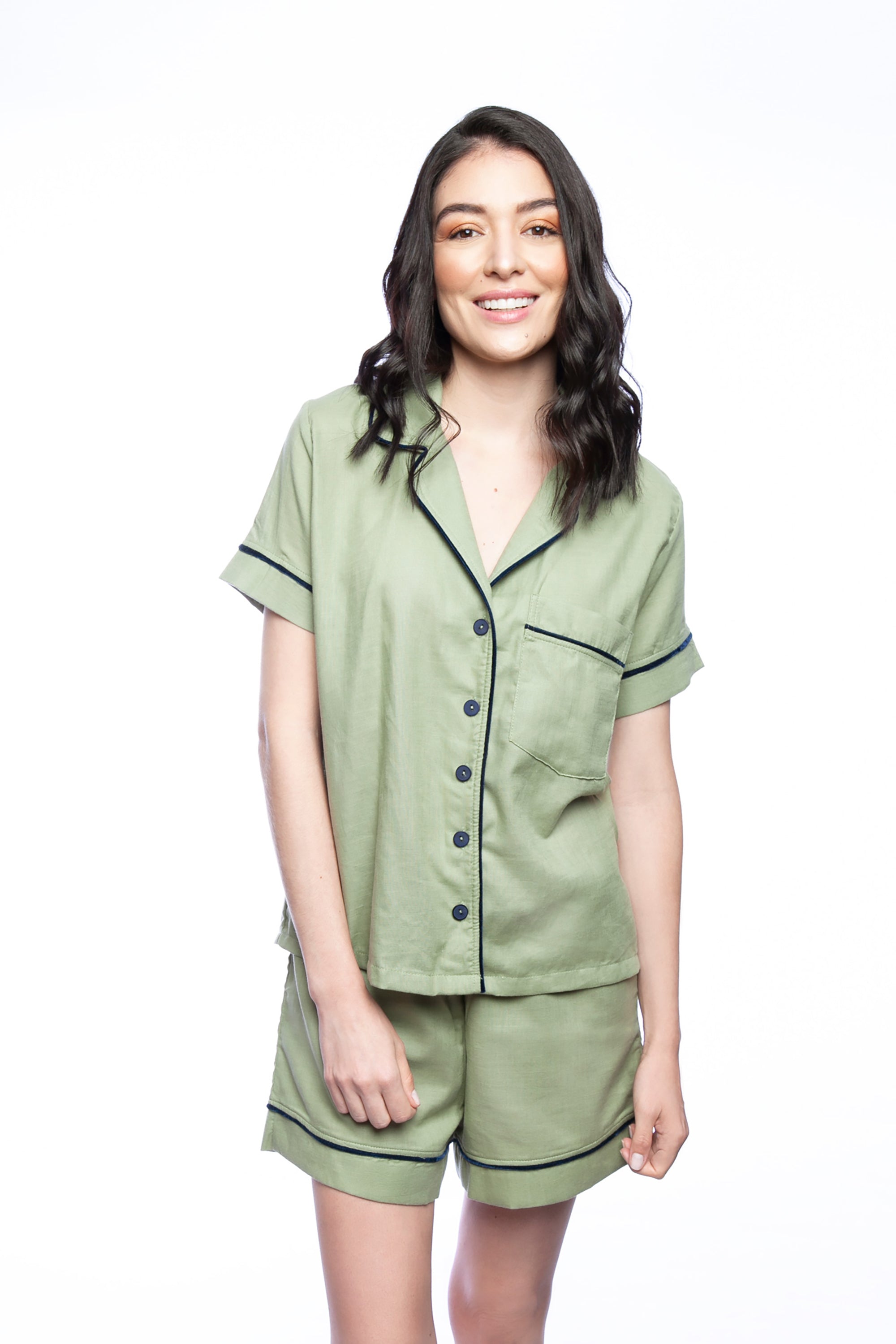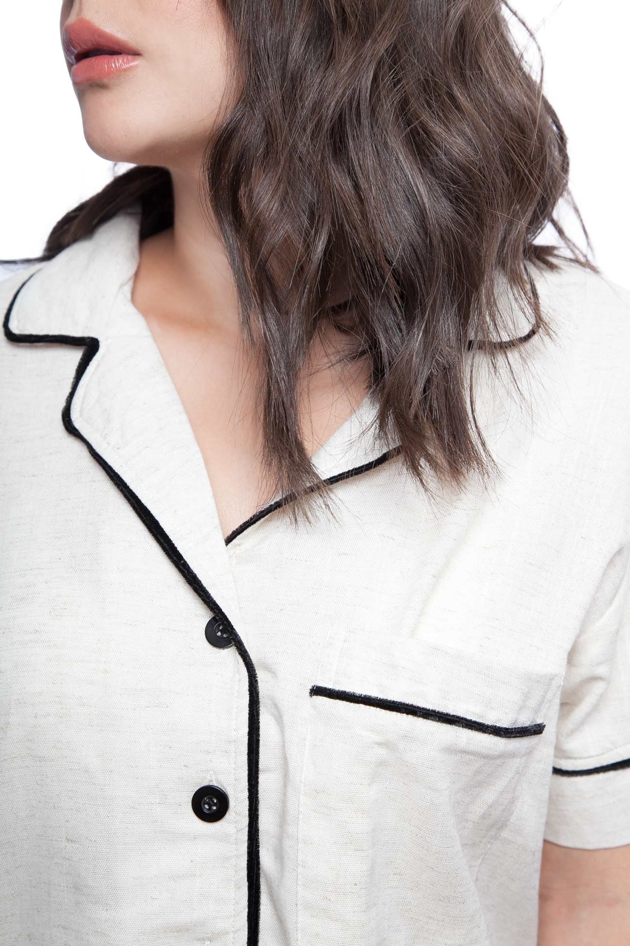 Introducing our Velvet Detail Pajama Set - the ultimate combination of style, comfort and breathability. Made with a blend of cotton (45%), viscose (38%) and linen (16%), these pajamas are designed with velvet details on the sleeves, neckline, and shorts. The shirt features a button-up design and pockets for added convenience. The shorts are loose and breathable, making them perfect for sleeping in. Available in a variety of colors, these pajamas are perfect for any occasion, whether it be lounging at home or as a gift for a loved one. Made with high-quality materials, this pajama set is built to last and provide ultimate comfort.